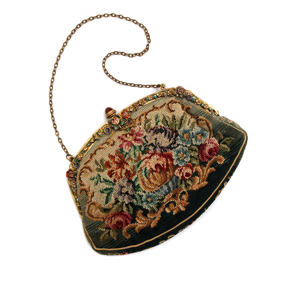 Unsigned multicoloured needlepoint purse with ornate painted gold frame and closure, and a cream silk interior.