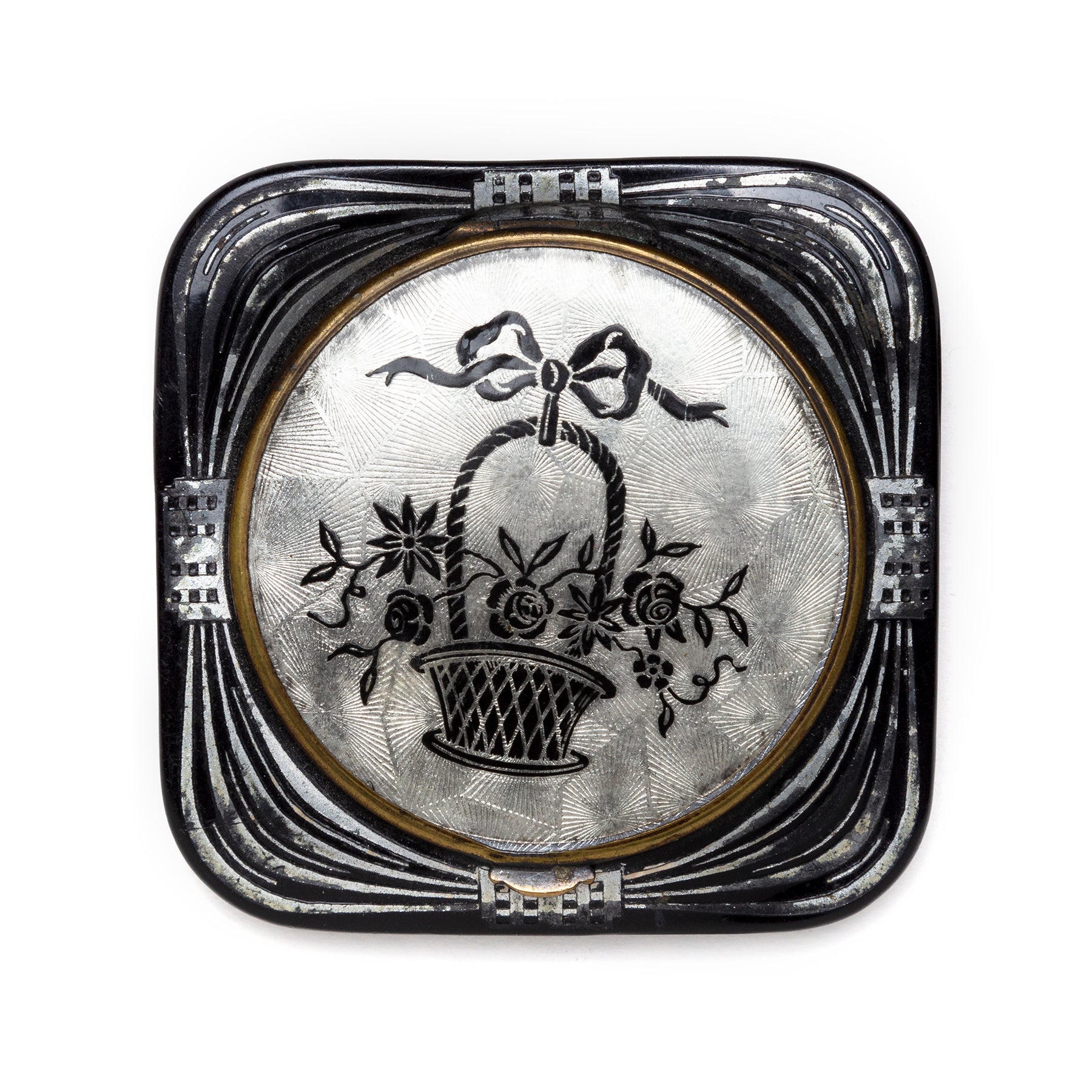 Black plastic compact with flower basket design against silver plastic. Made in France