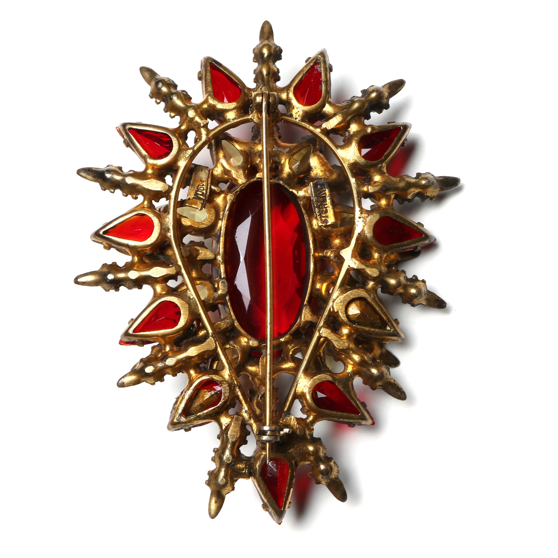 Spiky red and smoke brooch with multifaceted ruby colored central stone. Signed "Vogue" and "Sterling".