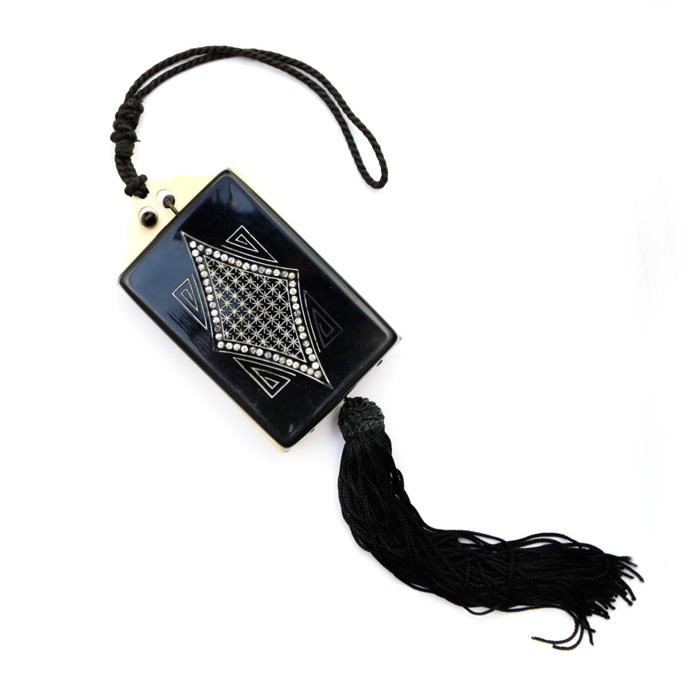 Unsigned compact with mirror, with built-in make-up holder and inside pocket in engraved black plastic case with inset diamanté stones, black cord handle and dangling black tassel.