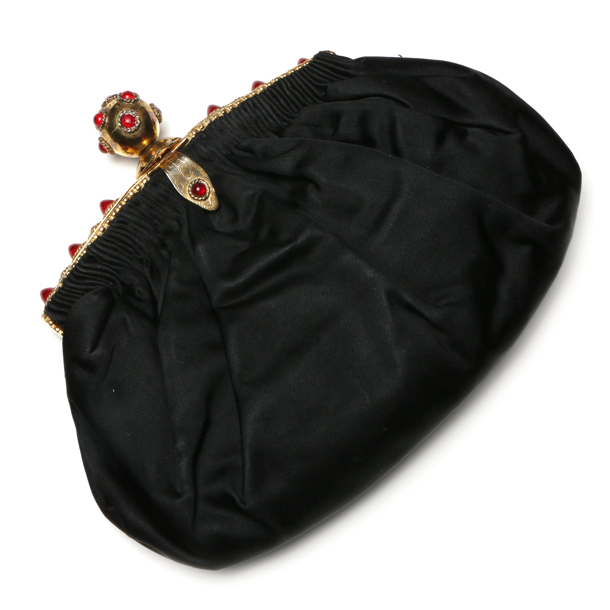 Black silk purse with a gold frame studded with red bullet cabochons and a studded ball closure. Unsigned.