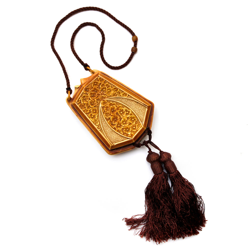 Unsigned Deco butterscotch celluloid vanity kit with floral motif and two brown tassels.