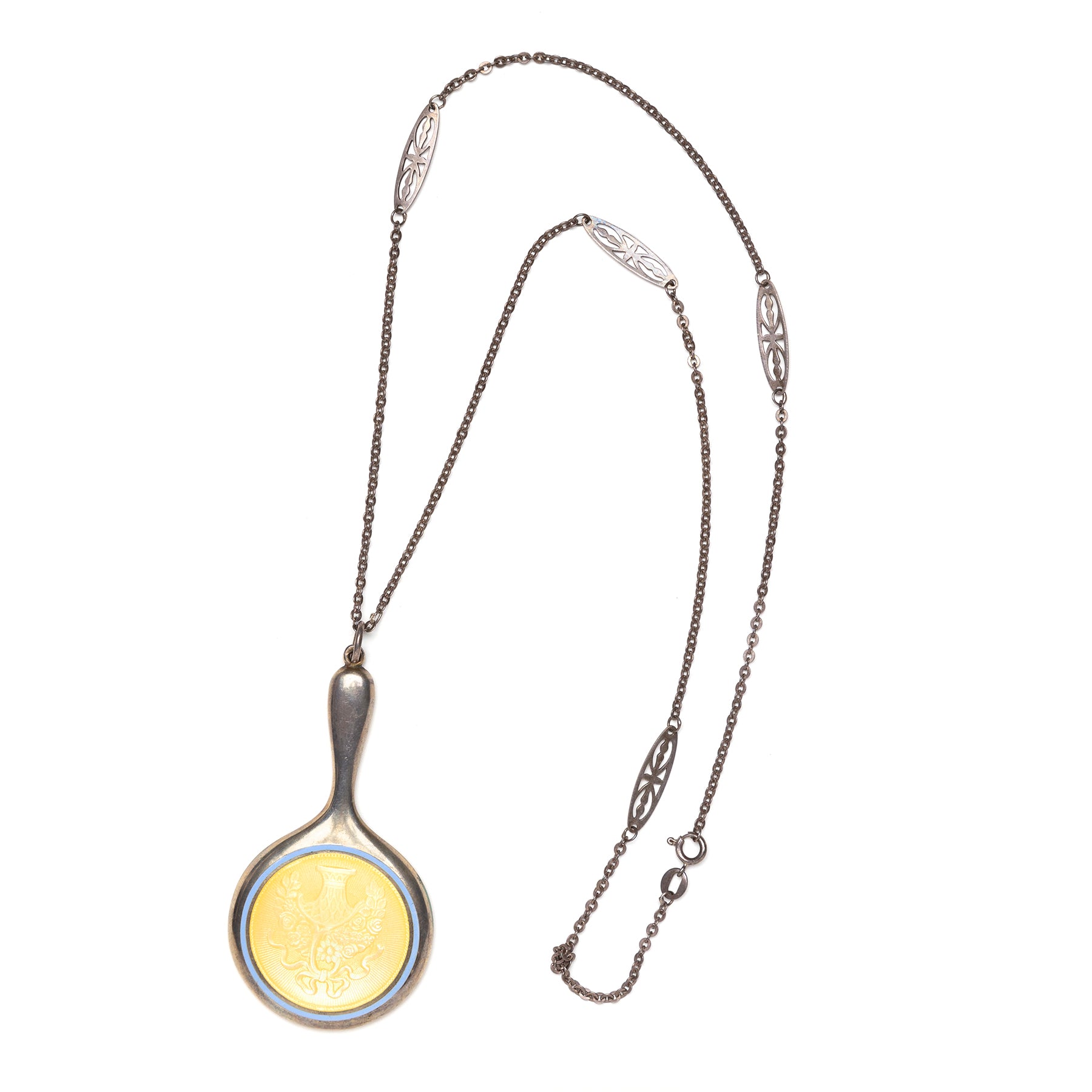 Guilloche yellow miniature handheld mirror with flower basket and bow design. Long chain.