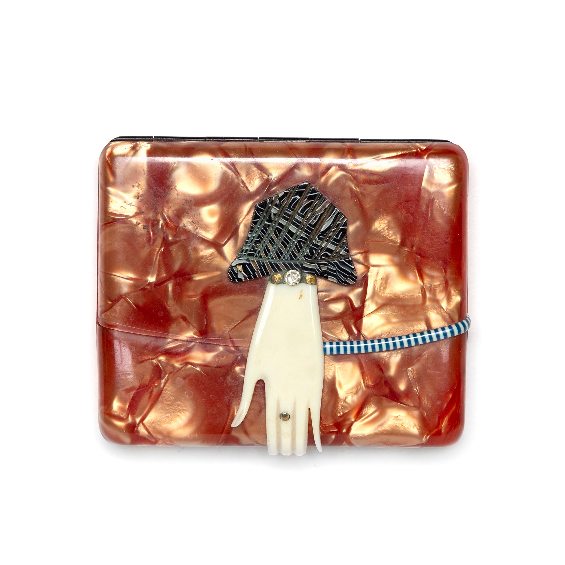 Marbleized, opalescent orange card case. With figural hand closure. Missing one side of decoration along edge.