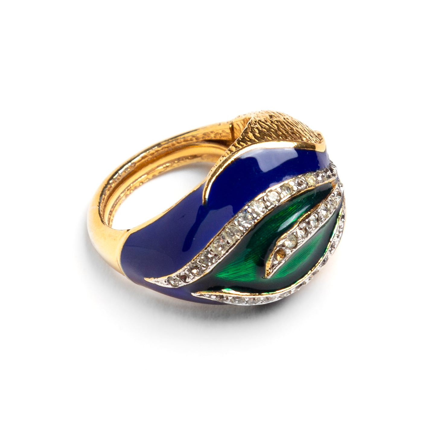 Green and blue enamel with diamanté on a gold-toned metal band.