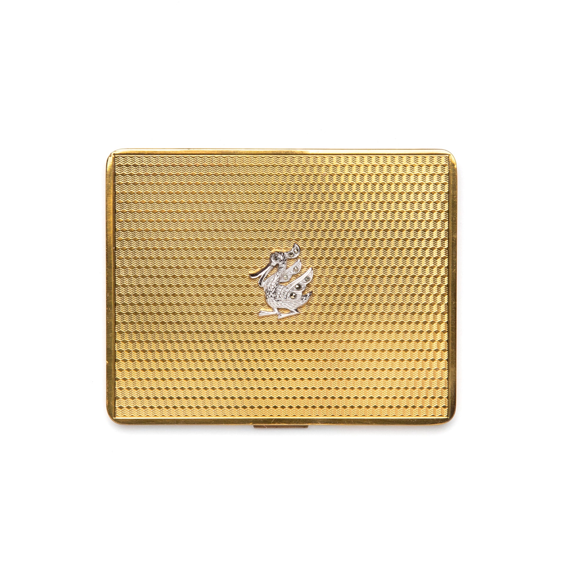 Gold-toned metal compact with diamanté duck on front. Original pink feather powder puff on the inside.