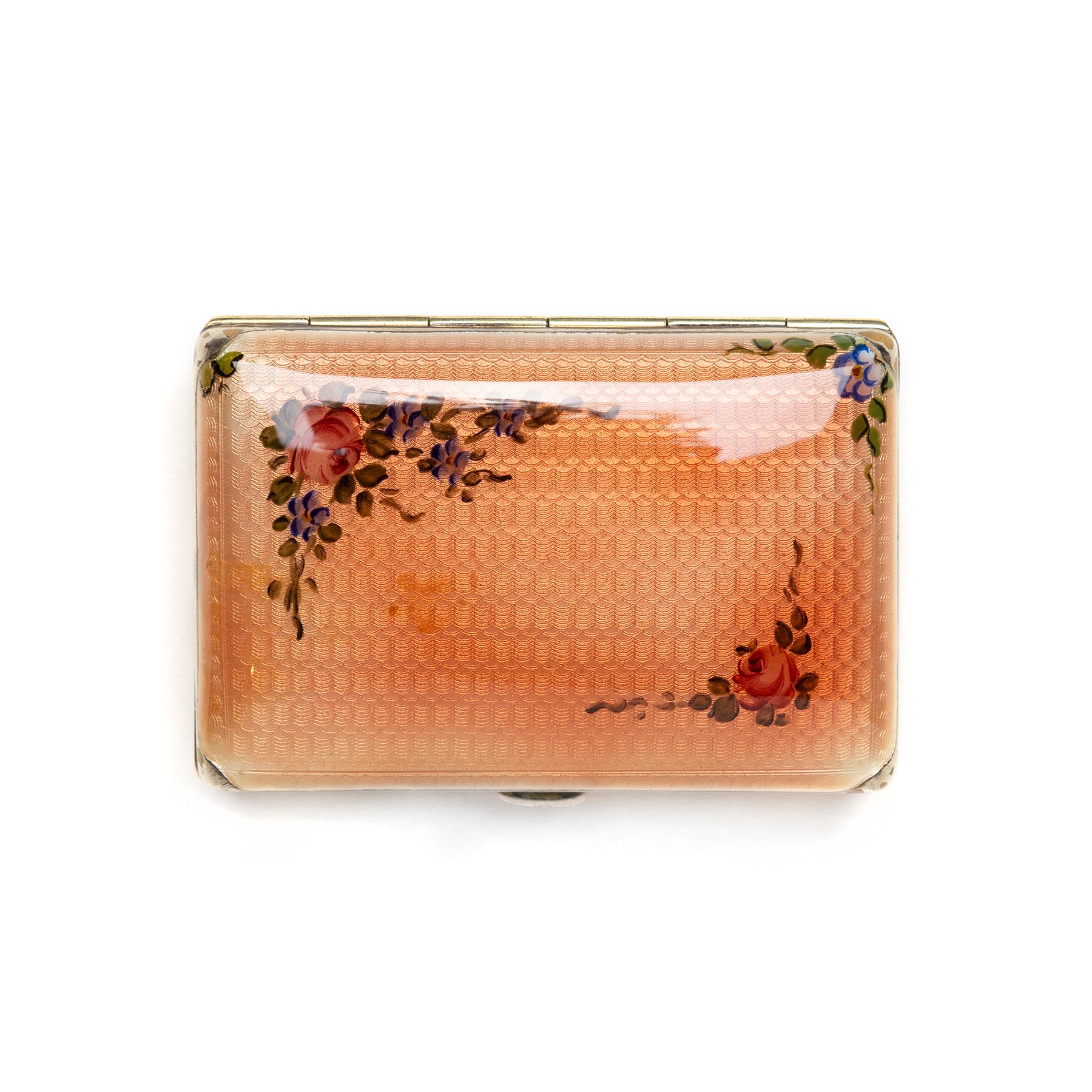 Floral painted guilloche case with gold-toned metal inside.