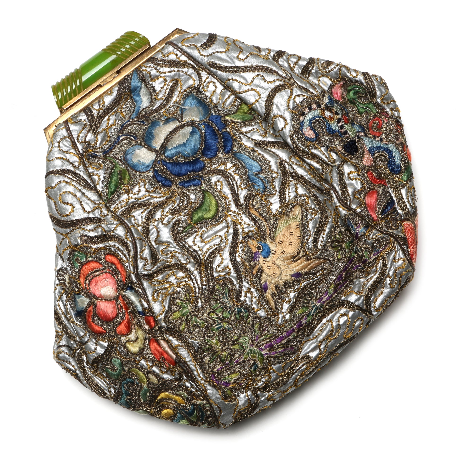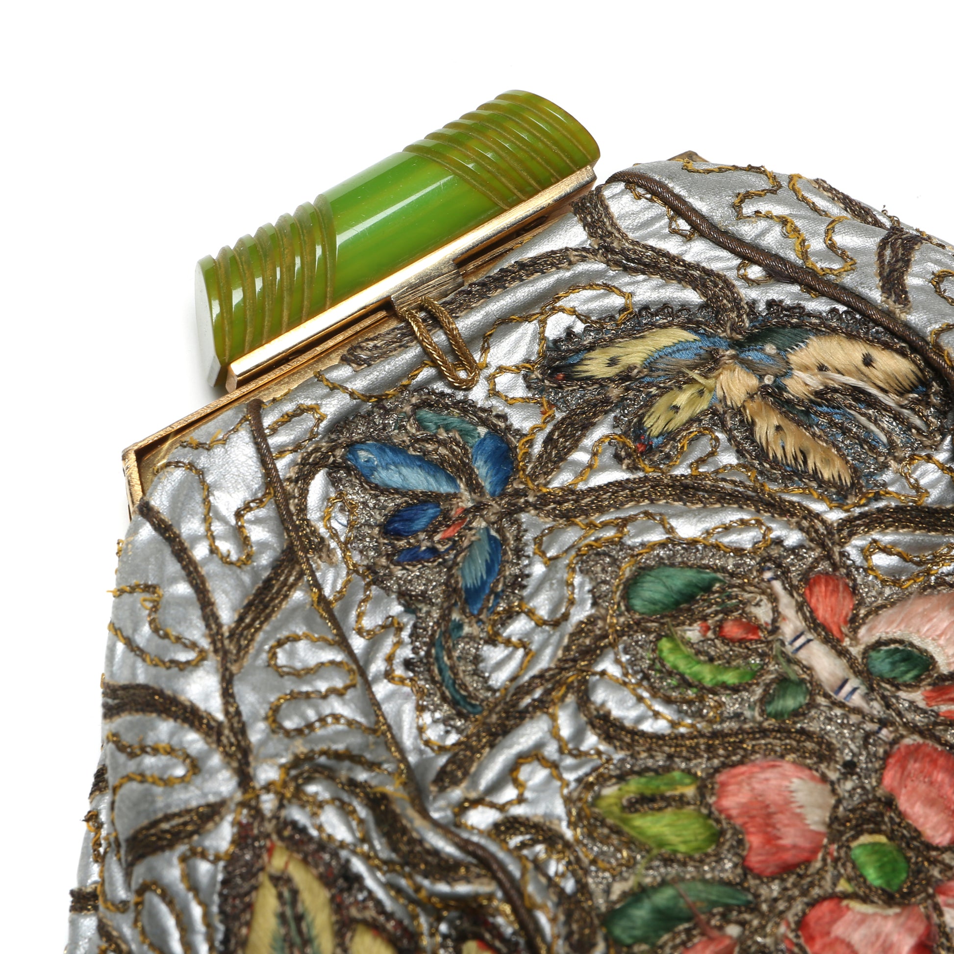 Silver silk purse embroidered with floral details and a green carved Bakelite closure. Unsigned.