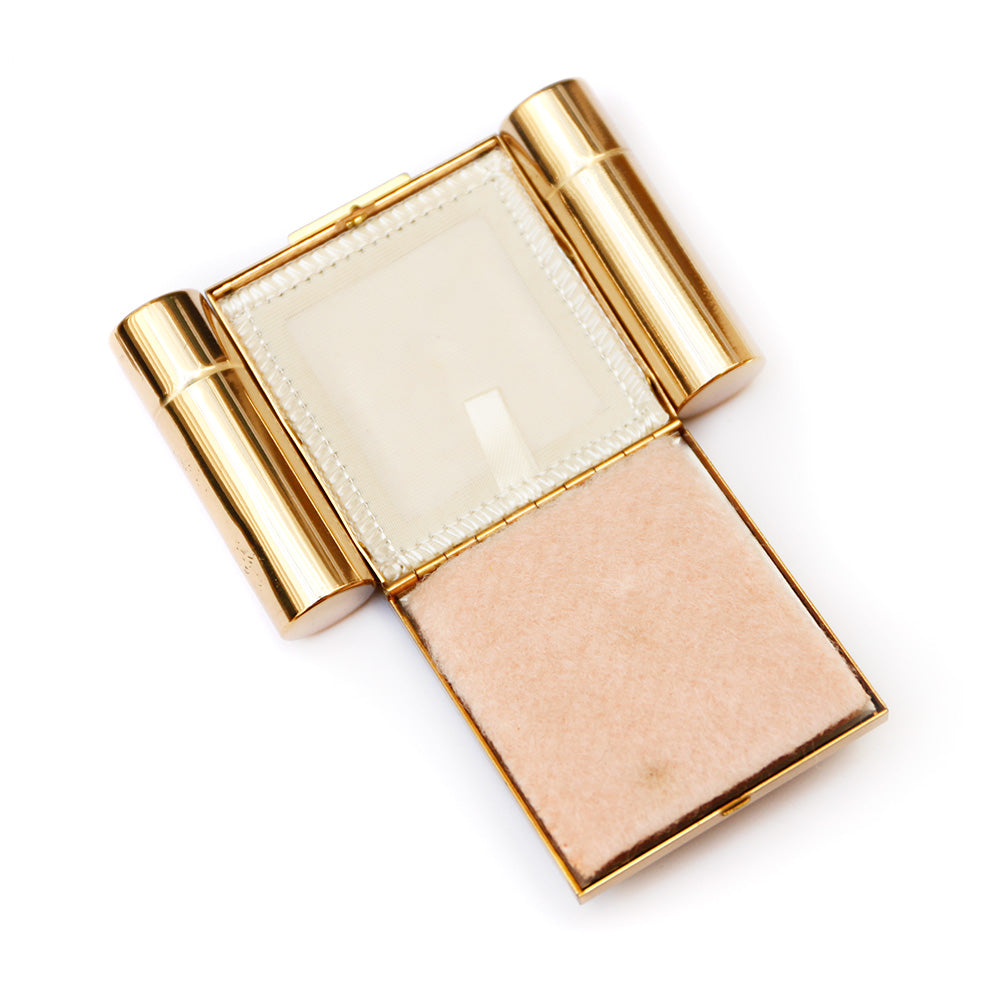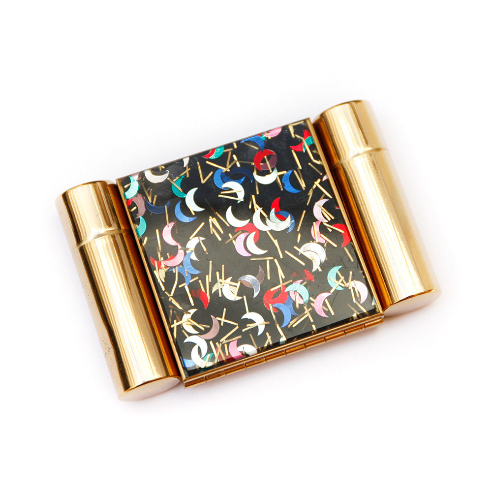Unsigned gold-toned metal compact with colourful confetti. Original powder puff included.