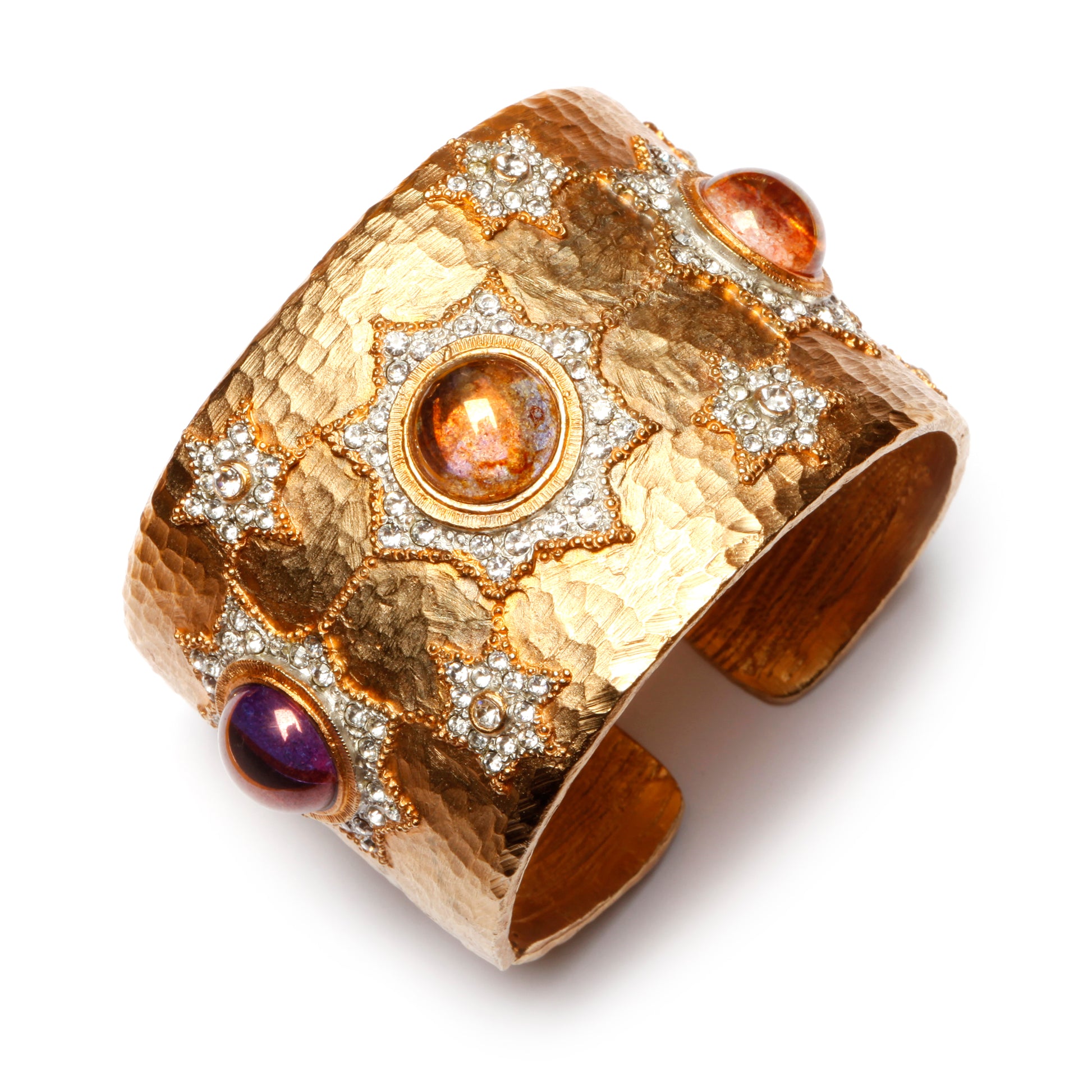 Hinged hammered gold bracelet with diamanté star design and colorful cabochons. Unsigned.