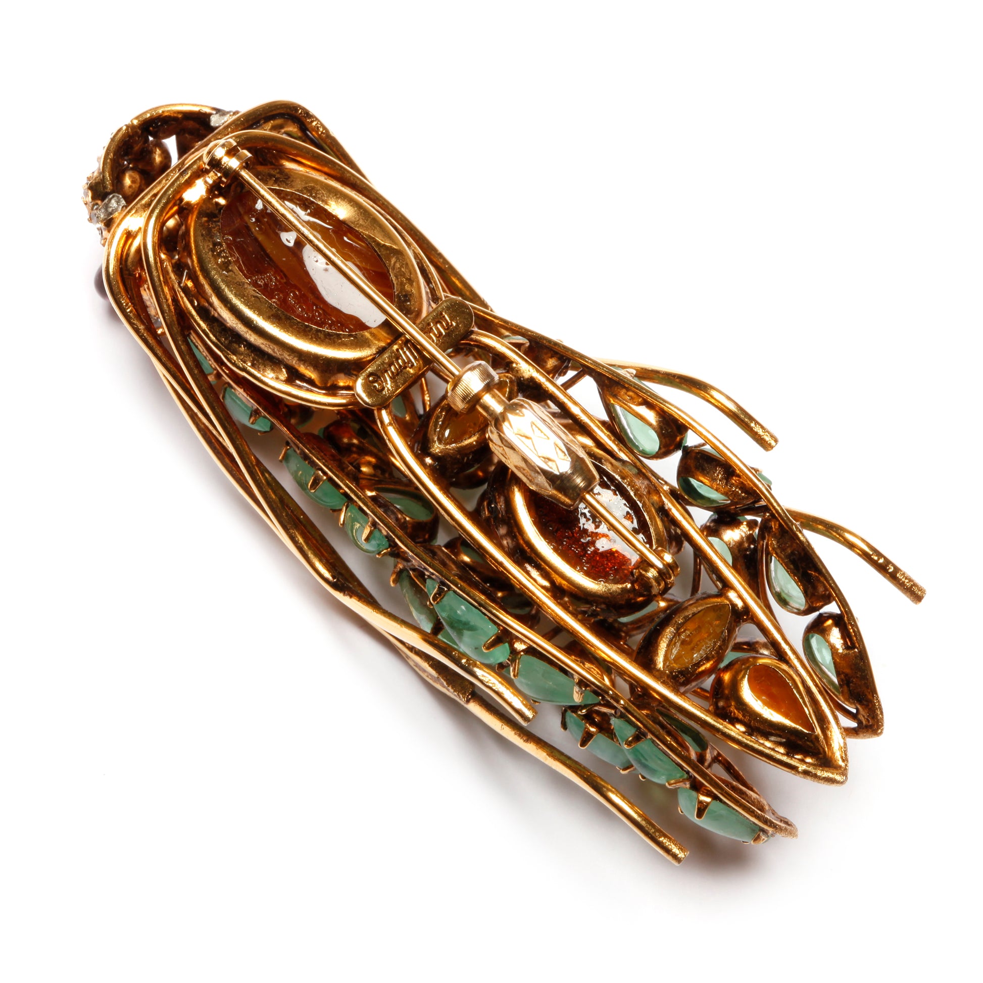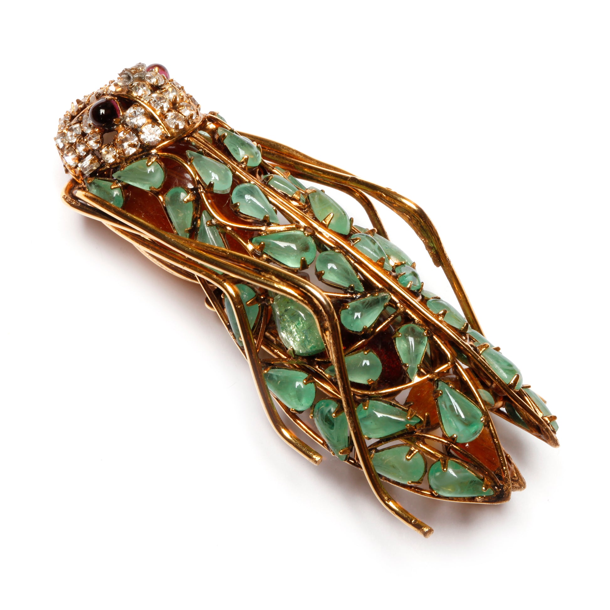 Gold-tone grasshopper with teal tear drop stoned body and diamanté head. Signed "Iradj Moini".