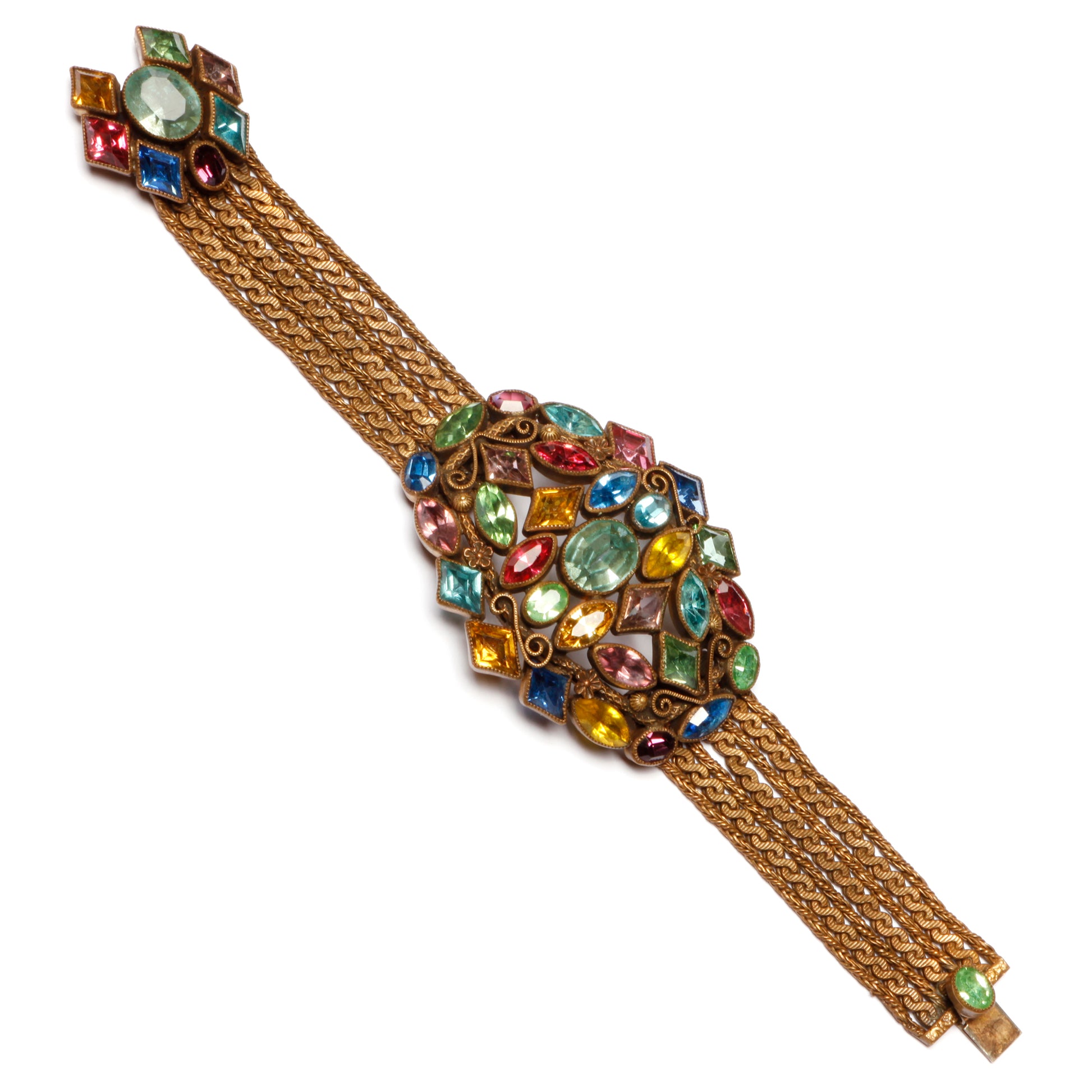Filigree bracelet with jewelled closure. Center medallion has typical filigree multicolor setting. Unsigned verified Original By Robert.