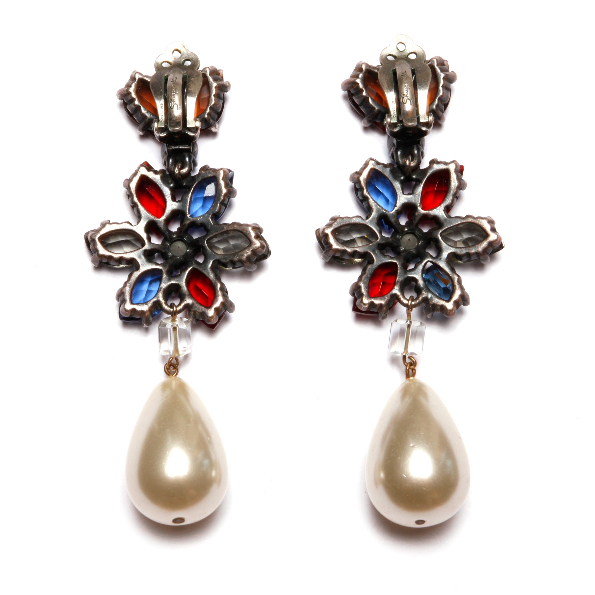 Large dangly earrings with jewel-tone flower and tear drop pearl. Signed Schiaparelli.