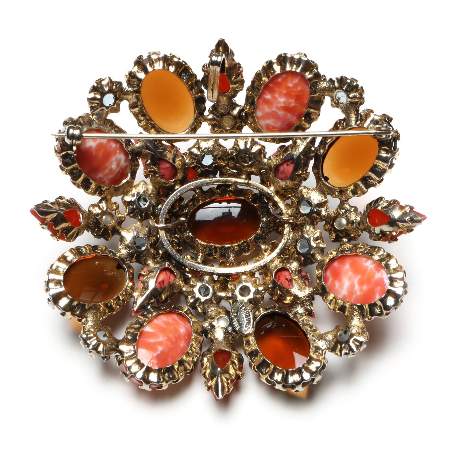 Domed amber pin with mottled coral stones and signature Schreiner prongs. Signed "Schreiner New York".